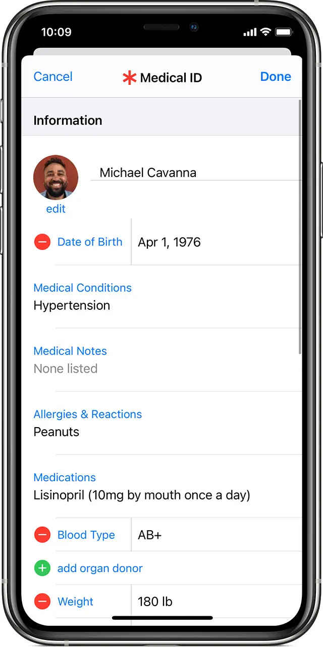 next to the contact, then tap Delete. - To make your Medical ID available from the Lock screen, turn on Show When Locked. In an emergency, this gives information to people who want to help. To share your Medical ID with emergency responders, turn on Share During Emergency Call. When you make a call or send a text to emergency services on your iPhone or Apple Watch, your Medical ID will automatically be shared with emergency services.*