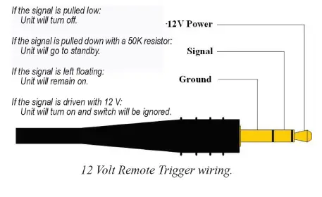 This powerbase is equipped with a remote trigger for use with other MSB products. The trigger uses a 3 pin mini jack. When any MSB product is turned off, the other products connected will also turn off and vice-versa. This trigger can also be used with other products. Products may use this trigger differently, so you may need to rewire a cable or use an interface relay. The connector is wired as shown. If you connect “signal” to “ground”, all MSB products will turn off. If you connect “signal” to “12 V” or leave it open, all MSB products will turn on.