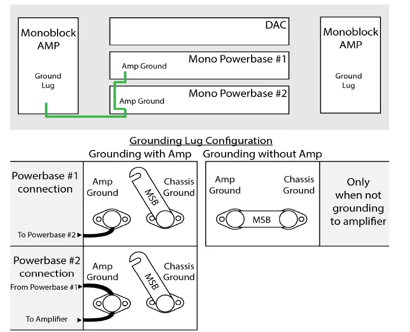 Attach the ground wire to the “Amp Ground” lug of both powerbases. Lift the jumpers between “Amp Ground” and “Chassis Ground” as shown above