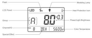 Short press the GR/CH button can adjust the wireless groups. When the group icon on the LCD panel is blinking, turn the light brightness adjustment button to set the groups. Long press the GR/CH button to adjust the wireless channels. When the channel icon on the LCD panel is blinking, turn the light brightness adjustment button to set the channels.