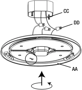 Tuck the wires into the outlet box and position the Fixture Plate (AA) over junction box. Align the Mounting Screws (CC) with the keyholes in the Fixture Plate (AA). Twist the Fixture Plate (AA) to the narrow side of the keyhole to lock in place. Secure Fixture Plate (AA) in place by tightening the Mounting Screws (CC).