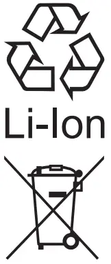 ![]() | Li-Ion battery. This product has been marked with a symbol relating to ‘separate collection’ for all battery packs and battery pack. It will then be recycled or dismantled in order to reduce the impact on the environment. Battery packs can be hazardous for the environment and for human health since they contain hazardous substances. |