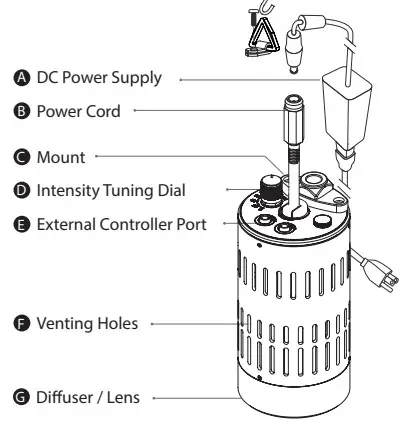 - Adjust the light Intensity Tuning Dial (D) to the desired