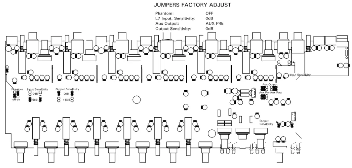 - AUX/REC output with a nominal output of 0dBV (10kΩload) and an extra gain setting of +6dB, enabled by internal jumper (0dBV is the default position).
