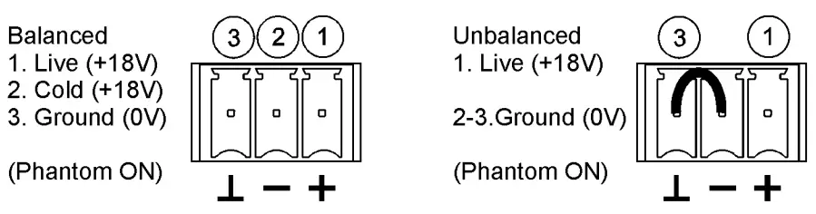 - +18 V DC Phantom power supply available for all “MIC” inputs.