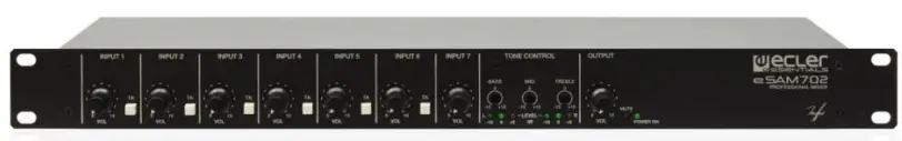 The eSAM702 mixer has been specially designed to be installed in a standard 19″ rack, taking up 1U. It has been designed to be operated by non-technical users. This is the reason why its tone controls are adjustable only with a screwdriver. On the opposite, input and output level controls use classic and easily accessible rotary knobs.