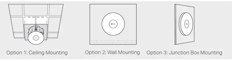 The EAP can be mounted to the ceiling, the wall, or in a junction box, using the screws in the package. Choose the appropriate mounting and installation steps below.
