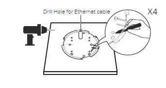 Drill four 4 mm (5/32 in) diameter holes for the screws and a 25 mm (63/64 in) diameter hole for the Ethernet cable at the marked positions.