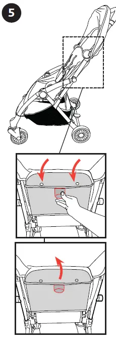 - 14. For additional basket access from the back of the stroller, undo both snap buttons and hook and loop sections , as shown.