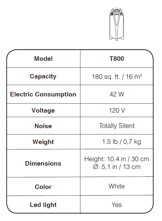 Always keep Airfree® in its vertical position as shown in the picture, otherwise the unit will be shut off until it goes back to the vertical position.