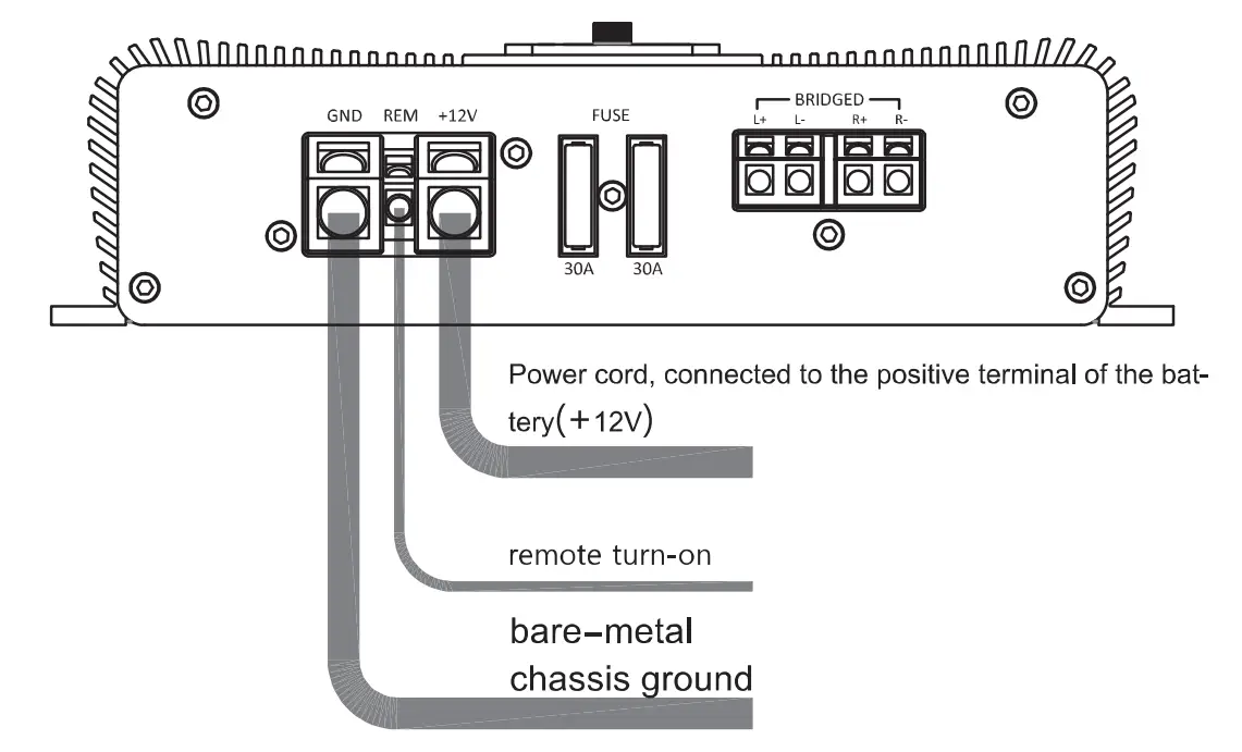 Connect the remote terminal to the remote output of your head unit. When using high level input, once the machine receives the signal, the power amplifier will automatically turn on (TURN ON). The remote connection of the power terminal (REM) will not be used.
