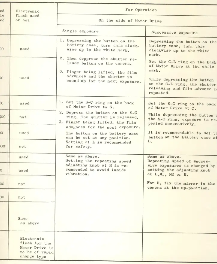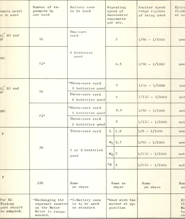 | F – 36 Three-core cord | Same as above. Repeating speed of successive exposures is changeable in 4 steps. | Has on the lefthand front of the Motor Drive a engraved white F letter.