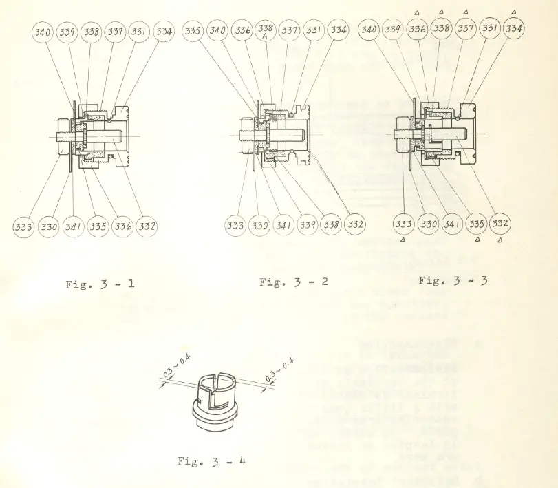 This deficiency in the terminal is likely caused by the loosening of nut #333 through the rotation of central spindle #332. Be sure that each pair of rotation stoppers #332 and #335, #335 and #338, #338 and #337, or #334 and #337 works effectively with each other. After assembling as shown in Fig. 3 – 3 tighten up #333, and thereafter, fix it with lacquer or by other adequate means.