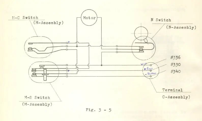- Furthermore, power source switches, fuses, etc. are to be arranged in the wiring as shown in Fig. 1 – 1, For connection of the terminal on the side of the Motor Drive, see Fig. 3 – 5. The plus(+) side should be connected to the Motor Drive terminal #330 and the minus (-) side to #336 and #340. Radio tester and megger (megohm tester)A radio tester such as usually used in a radio repair shop to examine conductivity. A megger, permitting measurement over 500V D.C. 20H