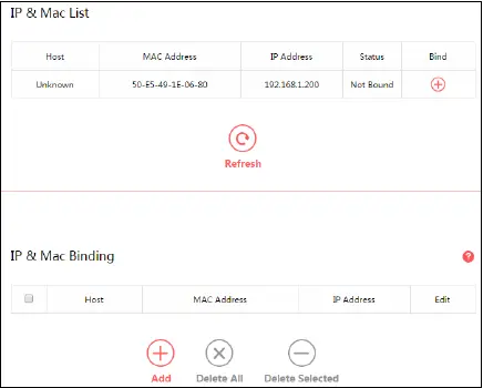 Status – Displays whether the MAC and IP address are bound or not.