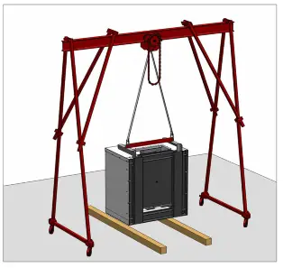 - Use a forklift or other suitable lifting means to set the oven body onto 4×4″ blocks oriented as shown. Refer to the DISASSEMBLY section of the manual for disassembly instructions.