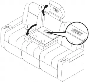 Lift the headrest then pull down on the backrest to open the Fold-Down Table. Push the button on the USB/110V Panel to access it. Push the USB/110V Panel shut when returning the Fold-Down Table to its upright position.