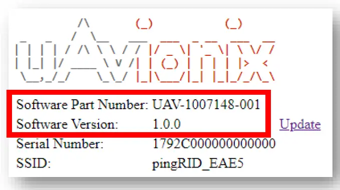 Annually, or as required, confirm the displayed “Software Part Number” and “Software Version” are current per Service Bulletins listed at: https://uavionix.com/support/pingrid/