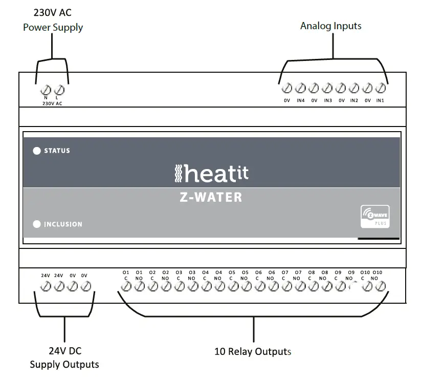 Heatit Z-Water is equipped with 10 relay outputs and 4 analog inputs, and a Z-Wave radio for interfacing to the wirelessZ-Wave network.The regulator can be power supplied from a 230V AC mains connection, and is able to deliver an output supply of 24V DC.Heatit Z-Water relay outputs are able to be freely controlled from the Z-Wave network, and can be used for severalpurposes, e.g. on/off control of light, control of valve actuators for an underfloor heating system, or control of other homeautomation systems.Heatit Z-Water inputs are analog inputs for interfacing simple temperature sensors; NTC, PT1000, etc.It is possible to configure the level and the indication of the status indicator LED in the front of the Heatit Z-Waterregulator.