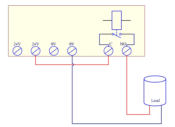 Schematic outline example of how the 24V supply output, together with a relay output, can be used to control a load.