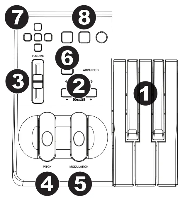 - Keyboard: Most of the white keys and black keys on the Keystation are labeled with names. When in the Advanced mode, pressing any of the labeled keys will allow for special operations such as adjusting the MIDI channel, transposing, and sending program change messages.