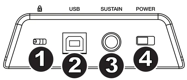 - USB Port: The USB port delivers power to the keyboard and transmits MIDI data when connected to a computer to trigger a software synth or MIDI sequencer.