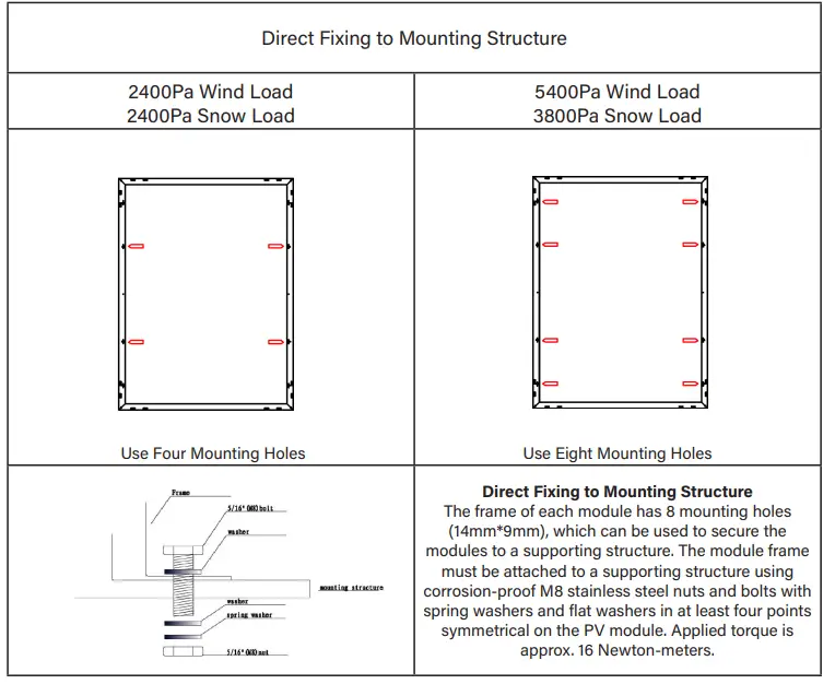 Note: The module mechanical load is based on the installation method and installation site. Calculation of mechanical load must be carried out by a professional installer according to the system design requirements.