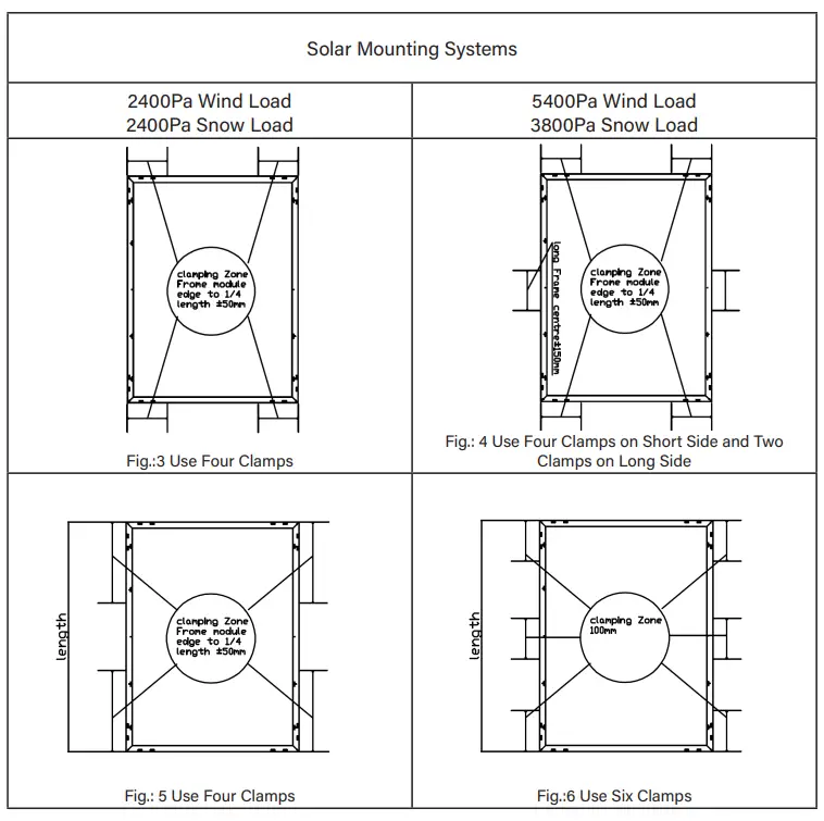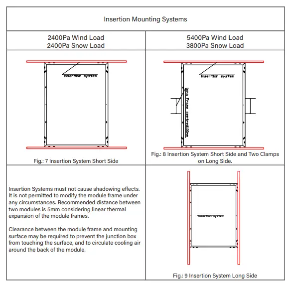 Module mounting clamps must not come into contact with the front glass and must not deform the frame. Module clamps should not cause shadowing effects. It is not permitted to modify the module frame under any circumstances. Recommended distance between two modules is 5mm considering linear thermal expansion of the module frames.