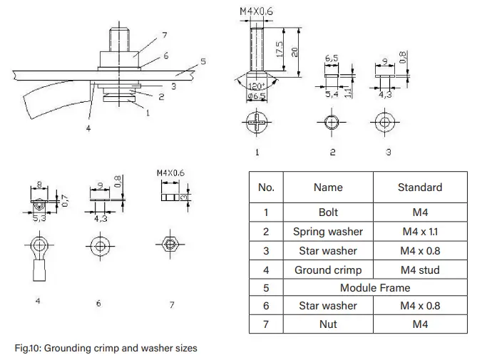 Attach a separate conductor to one of the marked 4mm diameter grounding holes on the module frame with a bolt and nut that incorporates an external tooth washer. This is to ensure positive electrical contact with the frame.