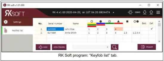 Only the keyfob names and serial numbers are imported from a file by the program. Button settings are not copied. If the “Def.” option is enabled for one of the keyfobs, its settings will be copied for all the keyfobs imported from a file. - Click