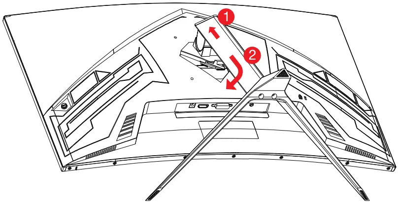 Gently place the product on a desktop or table with provided curved foam still attached and insert the assembled stand into the back of the monitor as shown in the illustration