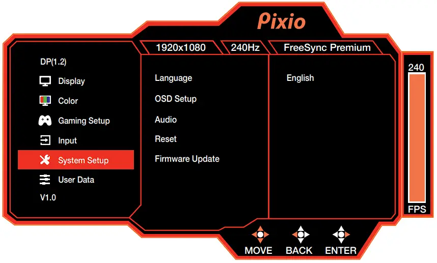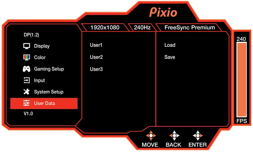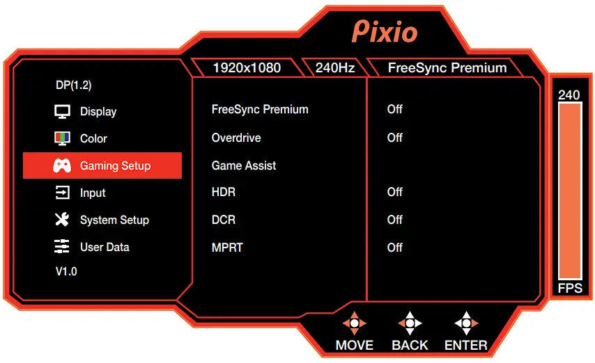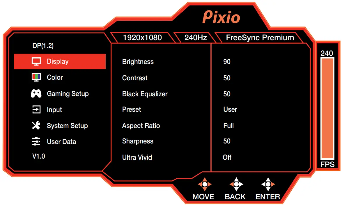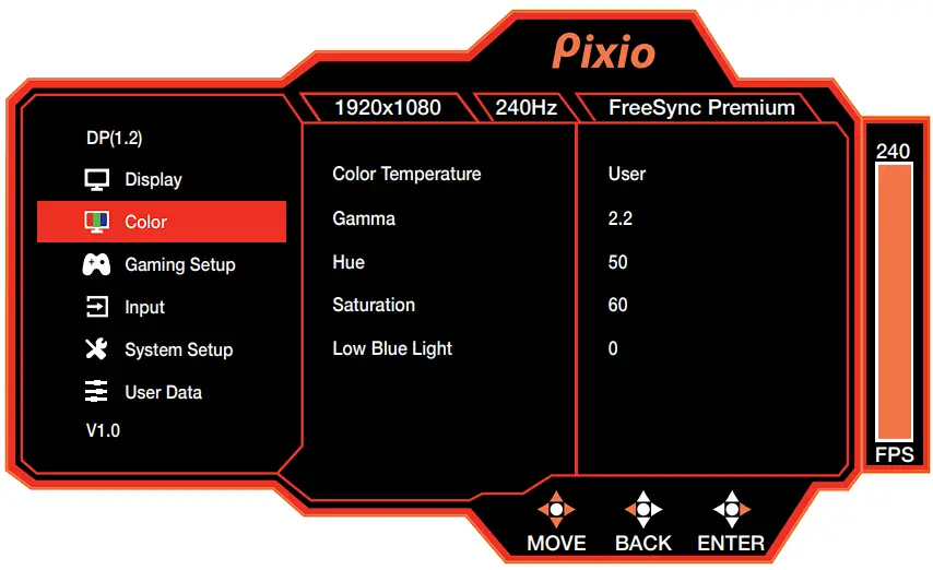 - Preset: Select Preset from Standard, User, Movie, Photo, RTS, FPS1, and FPS2.