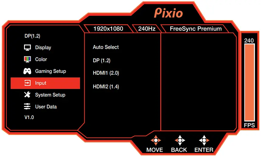 - Switch the signal input to Auto Select, DP (1.2), HDMI1(2.0), or HDMI2 (1.4)