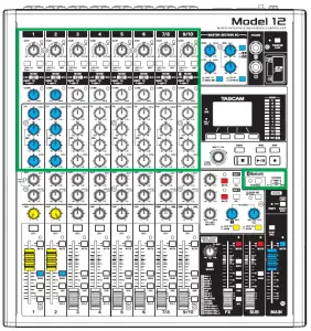 - The knobs, switches and buttons inside the green frame in the illustration below are enabled for sound sent to the computer.