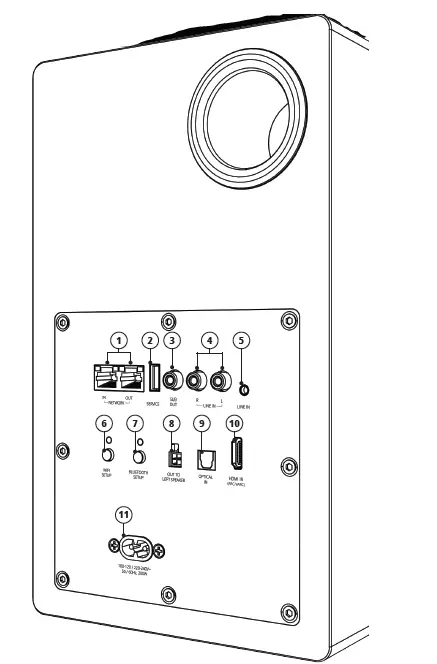 - Connect your source device to the HDMI In (ARC / eARC) 10 , Optical Input 9 , Left/Right RCA Line In inputs 4 , or the 3.5mm Line Input 5 on your Prime Wireless Pro Speaker System.