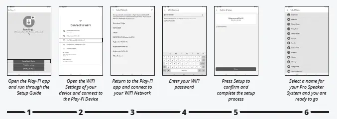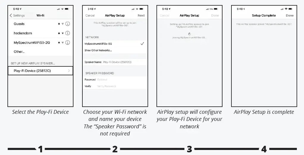 Setting up with an Apple Device iOS users Go to “Settings” -> “Wi-Fi” and select Play-Fi Device listed under “SET UP NEW AIRPLAY SPEAKER” on the lower portion of the screen (you may need to wait up to 1 minute for the speaker to appear). After selecting your Play-Fi device, confirm the desired network, and enter the desired name for your Pro Speaker System (e.g. Speaker System Lounge). You will get a confirmation screen when completed. Note that the AirPlay setup requires iOS 11.4 or later. If you are using an older version of iOS go to step Android users skip to step 3B.