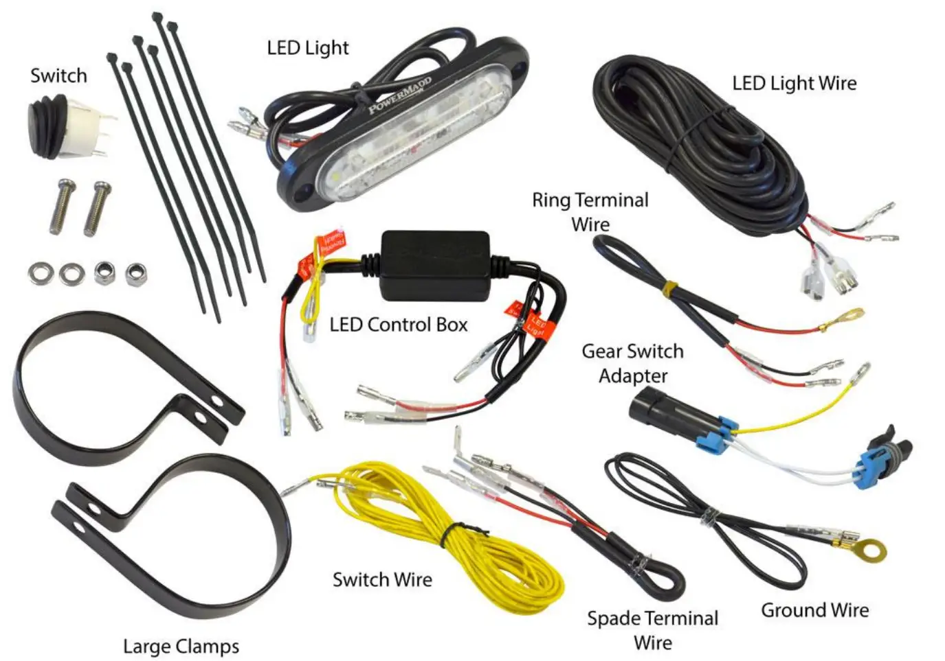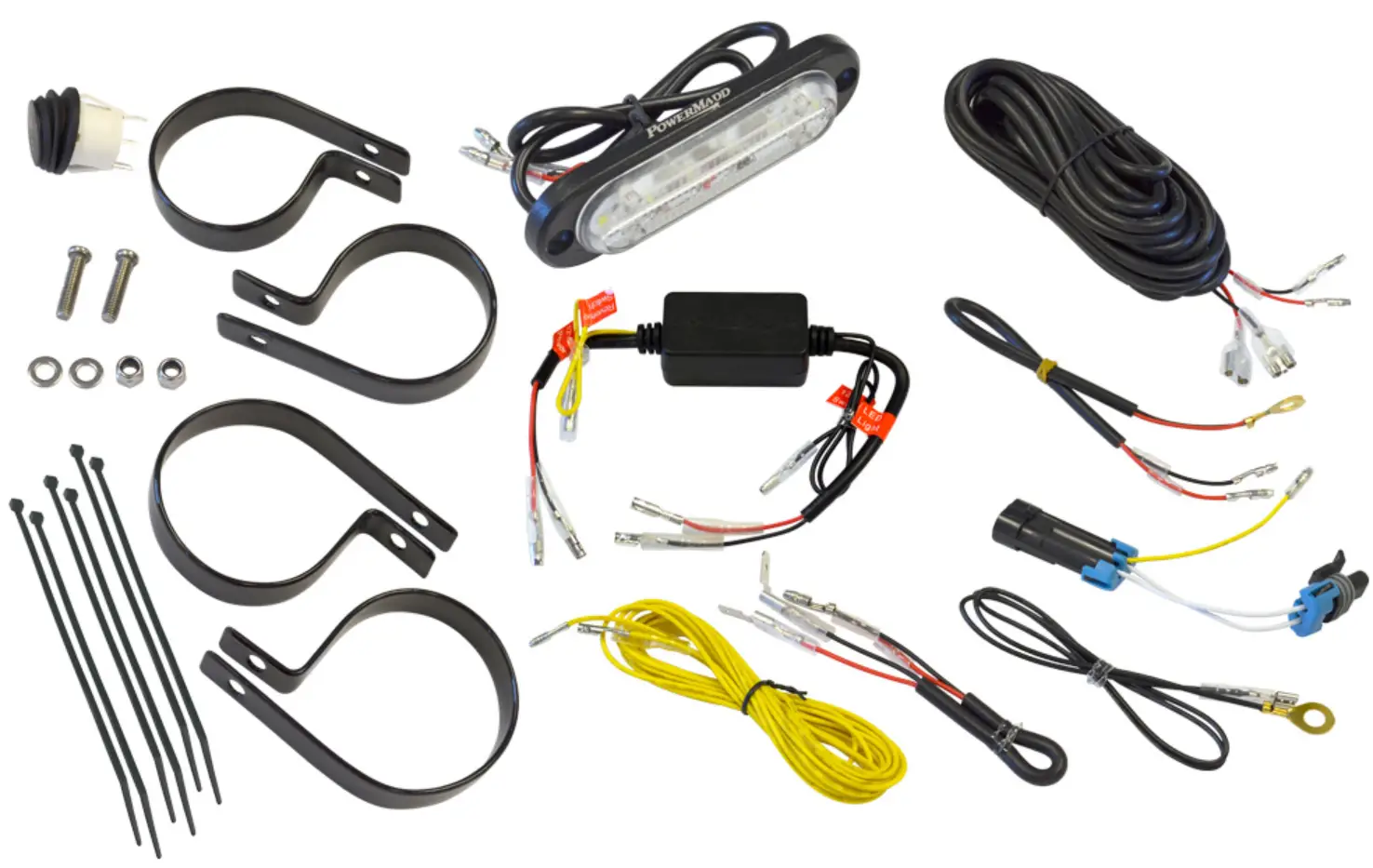 Route the LED light wire from the harness that is placed under the front hood to your LED light and connect the wires. Make sure you avoid all moving and hot surfaces. Secure wire using the included cable ties. Route the yellow wire labeled “reverse switch” down toward the reverse switch. Make sure you avoid moving and hot surfaces. Connect the yellow wire to the PowerMadd Gear Switch Adaptor that you installed in step 3. Secure wires using the included cable ties.