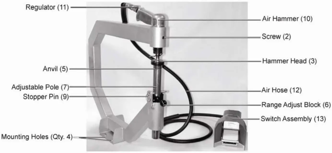 - Attach the Air Hose (not supplied) from the Air Compressor (not supplied) to the Foot Switch Assembly (13). Place the Foot Switch Assembly on the floor next to the Planishing Hammer.