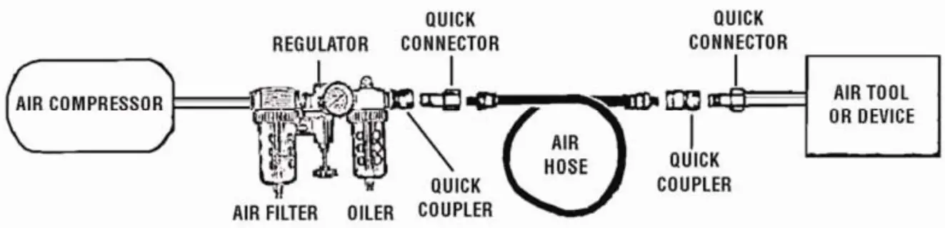 If the filter and oiler are not used, connect the air hose directly to the 1/4″ 18 NPT connector located at the Air Switch Assembly Inlet (13) fitting. Also, a few drops of pneumatic tool oil must be added through the air line before each use.