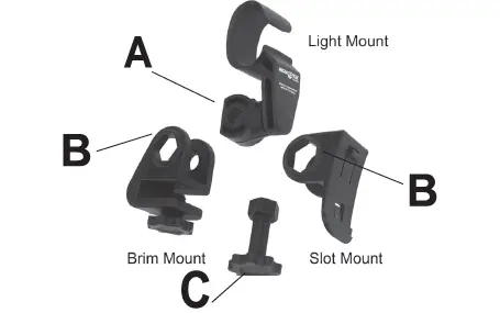 - Fit the Light Mount (A) into the slot of either the Brim Mount or Slot Mount (B) and securely tighten using the thumb screw (C).