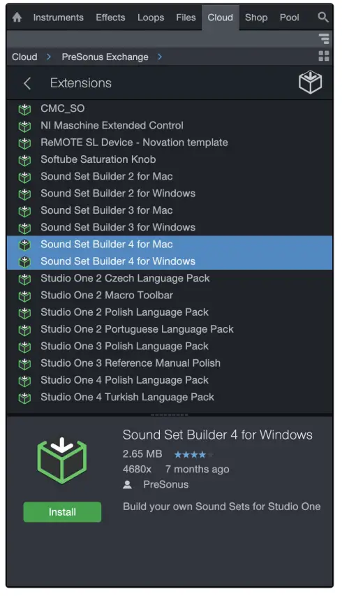 - Select Sound Set Builder 4 for your Operating System and install it by pressing the green “Install” button located at the bottom of the Browser window.