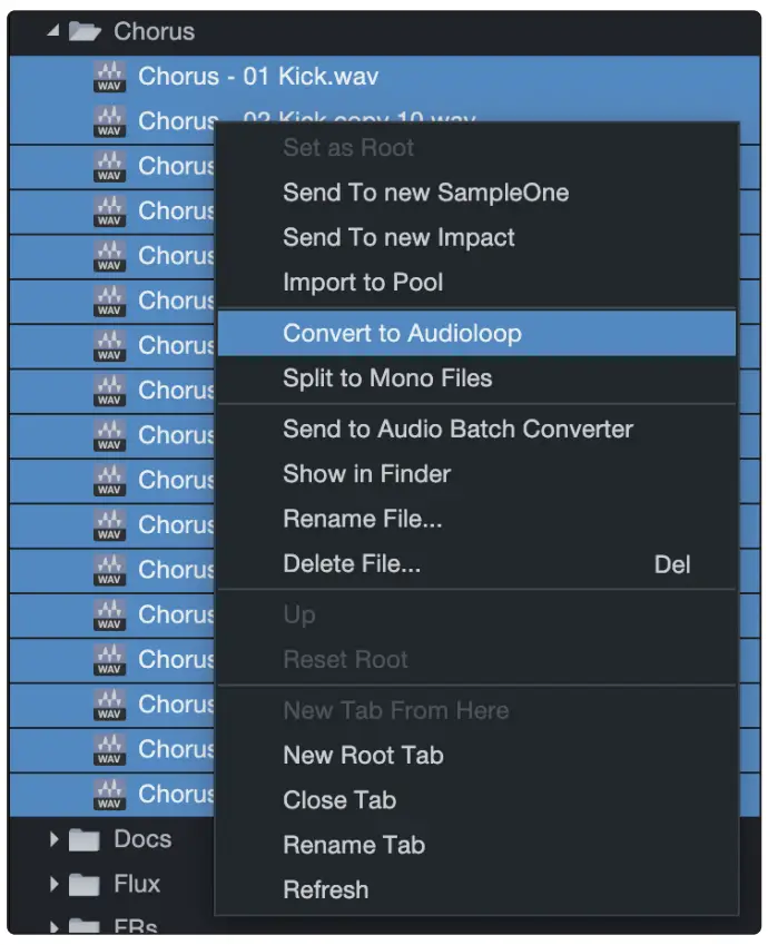 After adding Tempo and Chord Metadata to your WAV samples, select them in the Studio One Browser, then right-click and choose “Convert to Audioloop” from the context menu. See Sections 3.2.3 and 5 for more information on embedding Tempo and Chord Metadata.