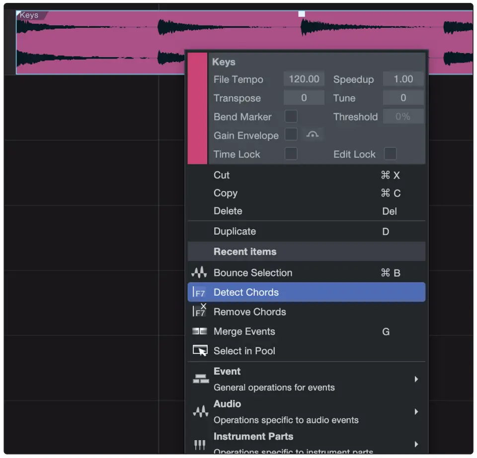 - Identify the loop that best represents the chord progression for the Construction Kit, then right-click it and select Audio > Detect Chords.
