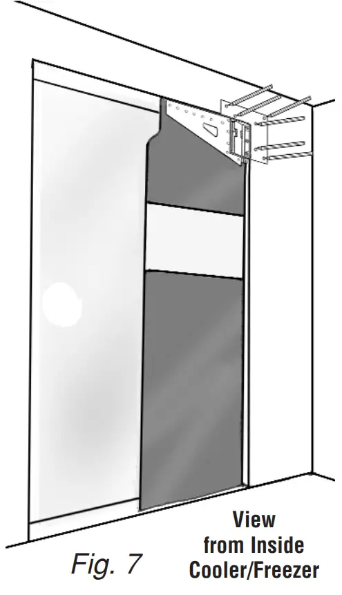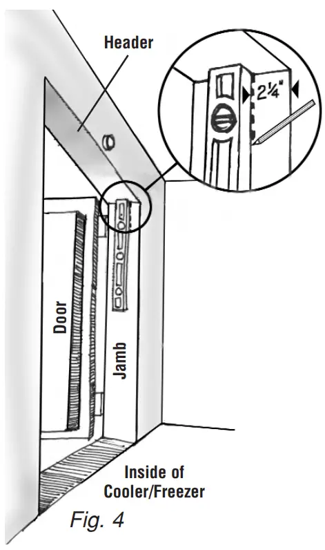 From inside the cooler/freezer, measure 21/4” in at the very top of the jamb and place a mark. Using a mason’s level, draw a straight plumb line 7” down from the mark. (See Fig.4 )