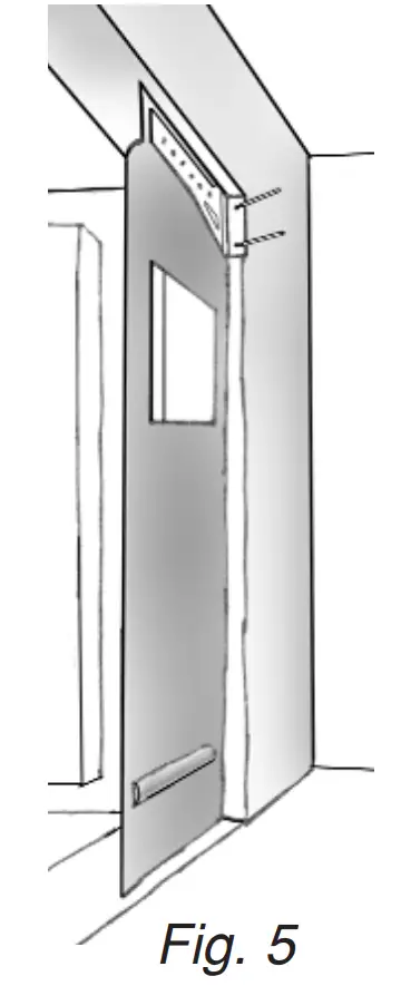 Place the “U” Bracket, with the PVC panel attached, against the jamb, touching the header and using the line to keep the panel vertically straight. Mark the 4 holes. Remove the unit and drill the holes. (See Fig. 5 )