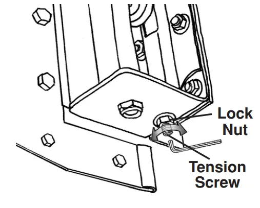 Using an allen wrench, move the tension screw clockwise to tighten or counterclockwise to loosen. Once the proper tension is determined, tighten the locknut.
