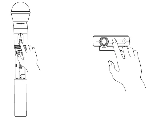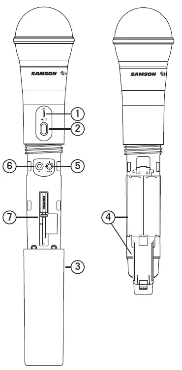 - POWER/MUTE SWITCH – Press and hold to turn the unit on or off. Press and release to mute or unmute the transmitter.