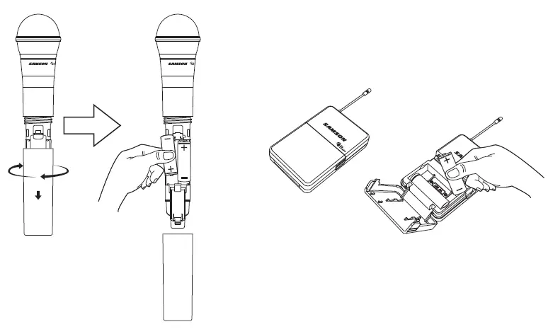 With the transmitter powered off, install two fresh AA batteries into the CB288 belt pack or CH288 handheld transmitter. Leave the battery compartment open.