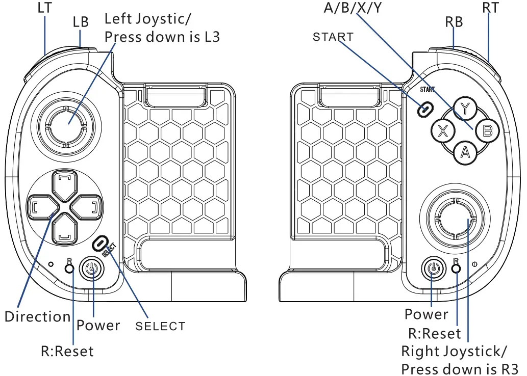 Press [ Down+Power key] on the left handle, and the handle [blue LED] will flash, Connect to Xbox Wireless Controller, Devices above iOS version 13 will support standard game pad functions,Some official games (MFi Games) support standard controllers.Such as: (Minecrafl) (Asphalt) (Call OfDuty) … ,This website has
