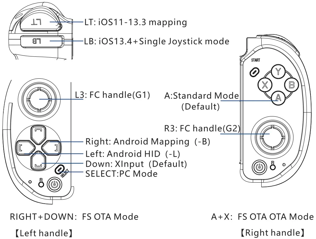 Android upgrade: left handle [Right+ Down+ Power]/ right handle [A+ X + Power] to enter the wireless upgrade mode and enter MOCUTE-FSApplication select the MOCUTE-FS-OTA, click [start upgrade].After 100%, the handle will automatically shut down, and press the [LB+LT+Power]/1B + Y + Power] key to turn on, turn the doublejoystic at the maximum diameter for 2 turns, and then turn off the joypad to calibrate the joystick. (note that the handle must be fully charged and partially charged during the upgrade processe. Some chargers have interference, Do not upgrade when charging.